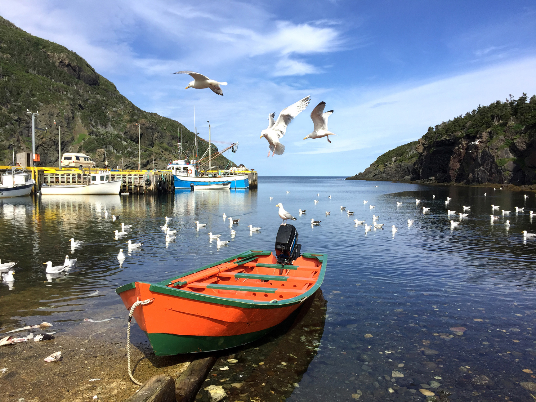 These deposits show that immediately after deglaciation, an arm of the sea known as “Jukes Arm” after a pioneer of Newfoundland geology, penetrated as far as Deer Lake at the eastern limit of the Geopark. Most of the rebound probably occurred between 13 and 10 ka, while more recent times have seen a slight rise in relative sea level caused by the melting of glacial ice elsewhere. Marine terraces abound along the coasts, and most communities are built on such platforms, three to 10 m above present-day sea level. A lower terrace is typically occupied by fishing cabins and brightly coloured fishing dories (small flat bottomed boats that are hauled ashore when not in use).