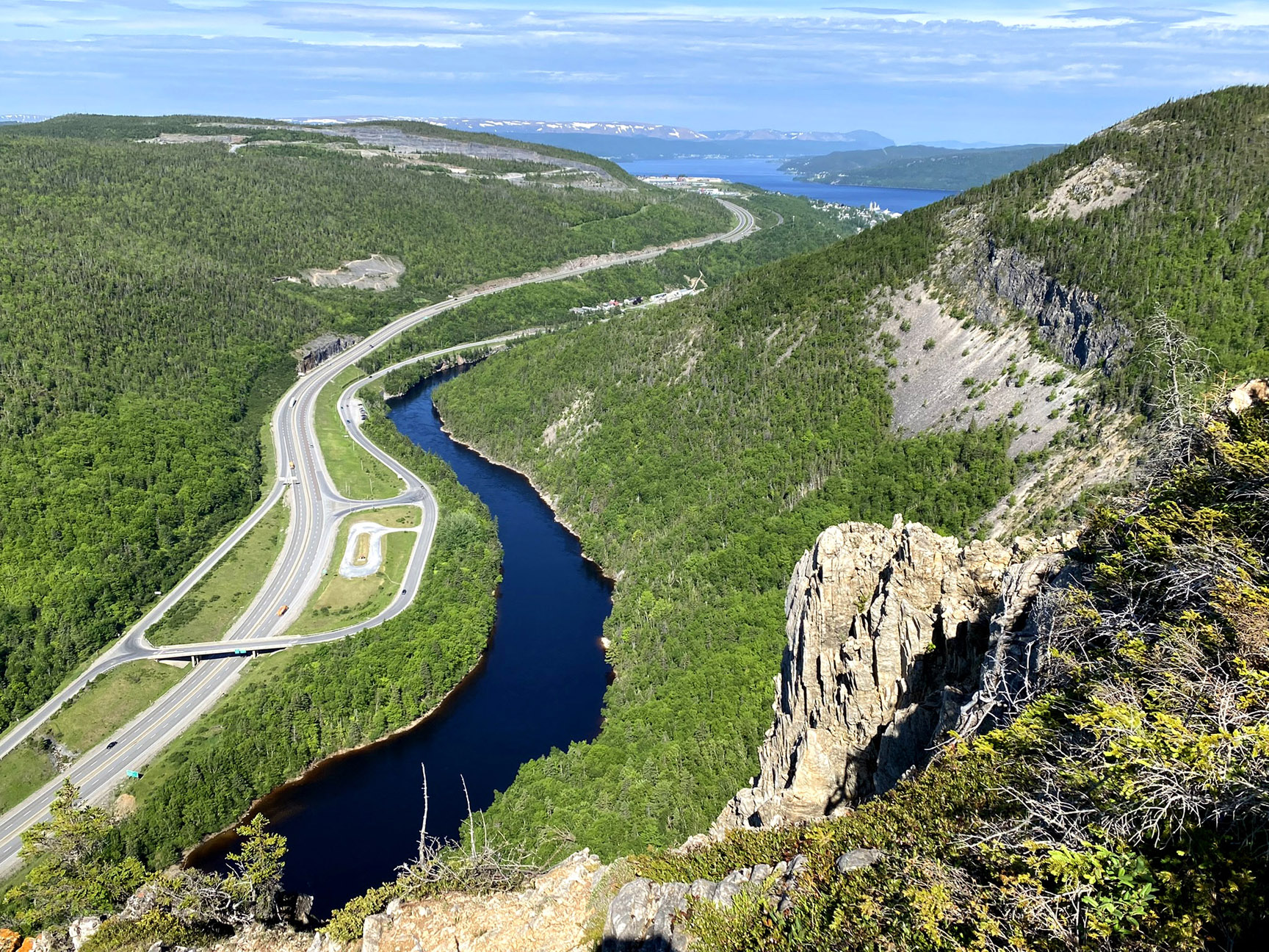 Several larger lakes in the Geopark area are formed behind end-moraines composed of glacial till, while glaciofluvial deposits (such as kames and eskers) are quarried for their resources of well-sorted sand and gravel. Most valleys in the area have characteristic U-shaped profiles characteristic of glacial erosion, but the Humber Valley, through which the Trans Canada Highway passes, is V-shaped and is believed to have been formed by water, possibly flowing through a cave system and now collapsed. The glacier that formed the Humber Arm, the largest of the Elamastukwek fjords, flowed north of the Humber Gorge, exiting through a large U-shaped but largely dry valley at Hughes Brook. Other karstic features include the Lomond Sinkhole and the Corner Brook Stream cave system, both featured in Geosites within the aspiring Geopark.