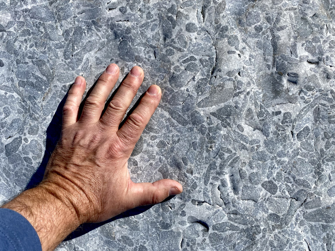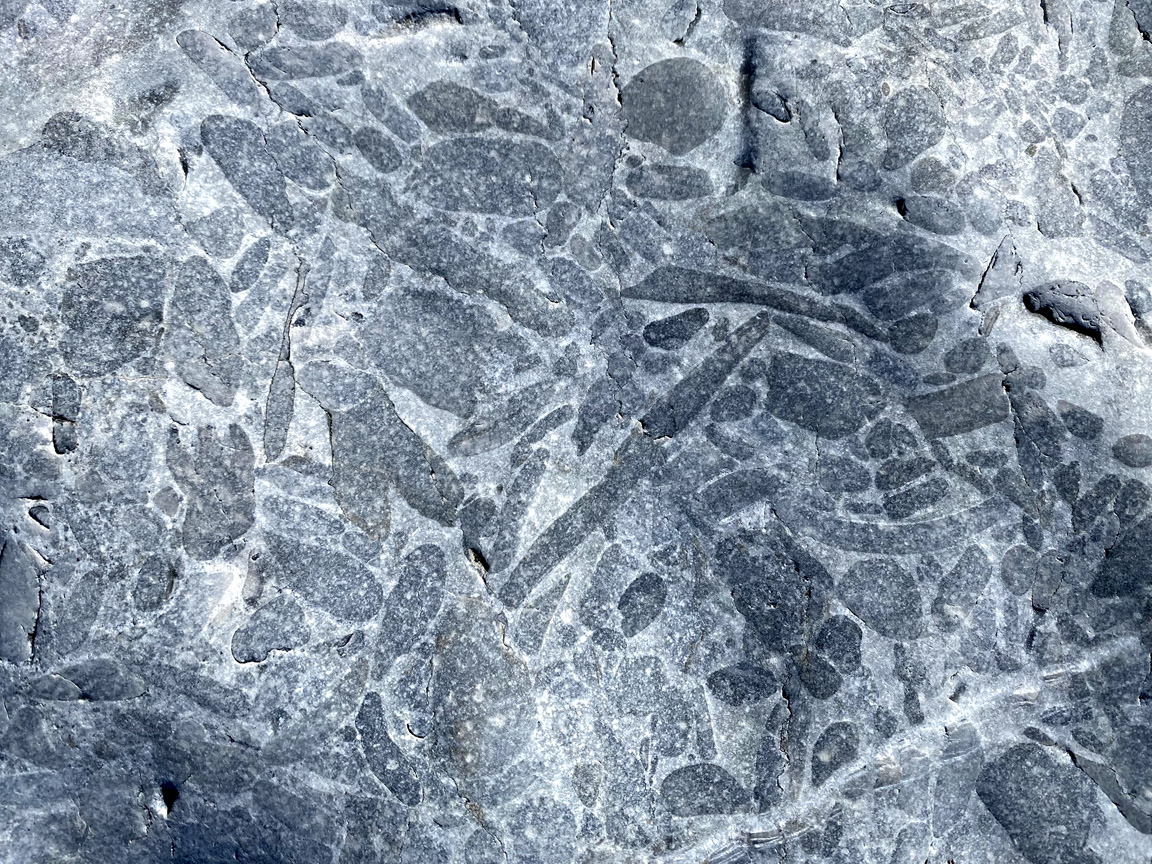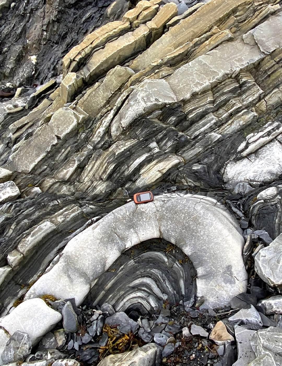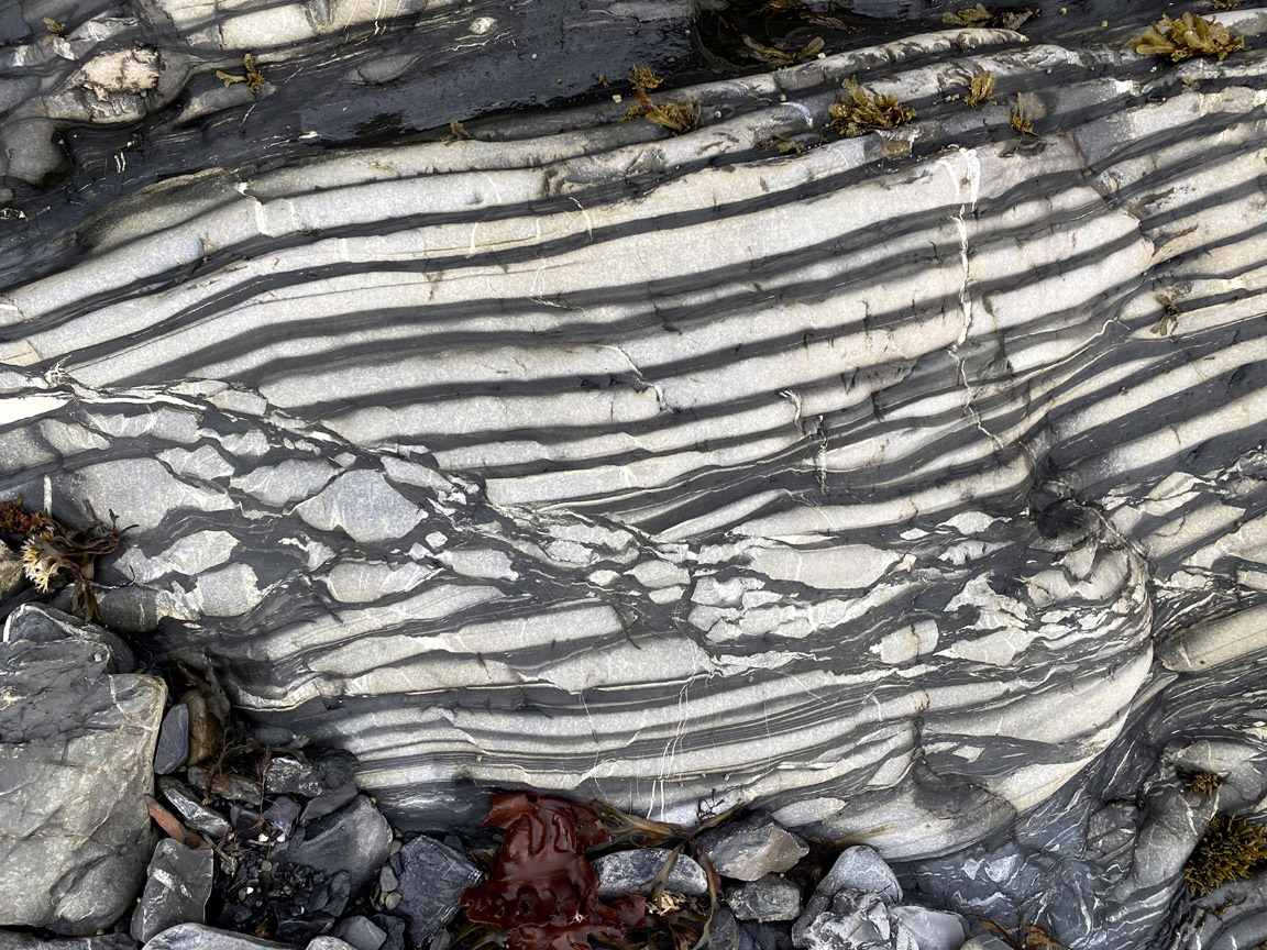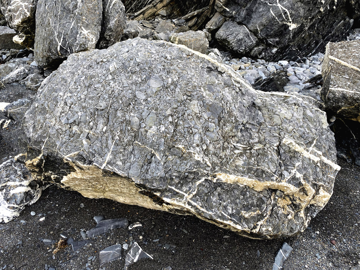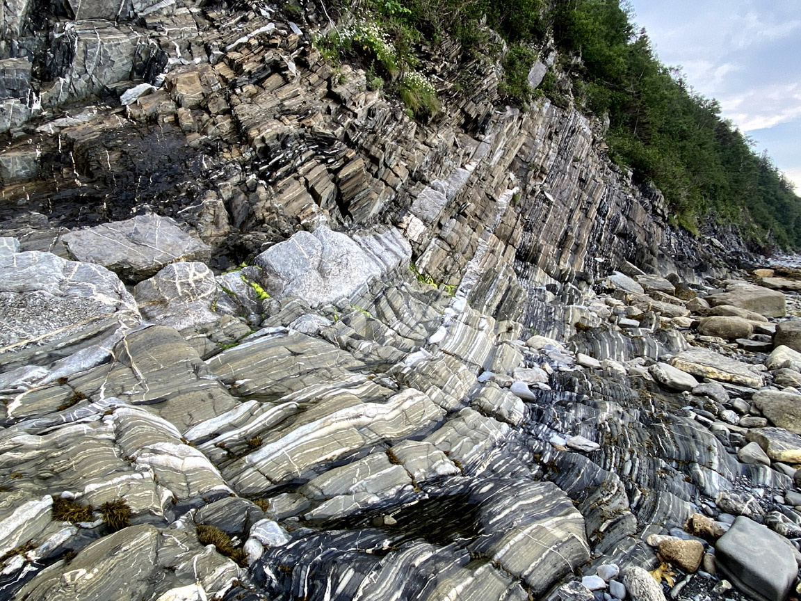 This beach to the west of Cox’s Cove exposes a magnificent section of limestone and mudstone of the Cook’s Brook Formation, deposited in deep water in the later Cambrian and Early Ordovician Periods between about 510 and 480 million years ago. During this time, the eastern margin of ancient North America (Laurentia) featured a warm, shallow, tropical environment teeming with life, leading to the deposition of thick beds of limestone. Farther offshore in deep water, mud full of dark organic matter from decaying microscopic organisms was deposited, with clouds and avalanches of pale limey sediment periodically rushing down the continental slope to deposit layers of limestone. The result was the stripy cliffs seen here, with alternating layers of pale limestone and dark mudstone. From time to time, an avalanche of coarser pebbles would come down the slope and deposit a layer of limestone conglomerate, which is best seen at the far end of the cliff, towards Brakes Cove.