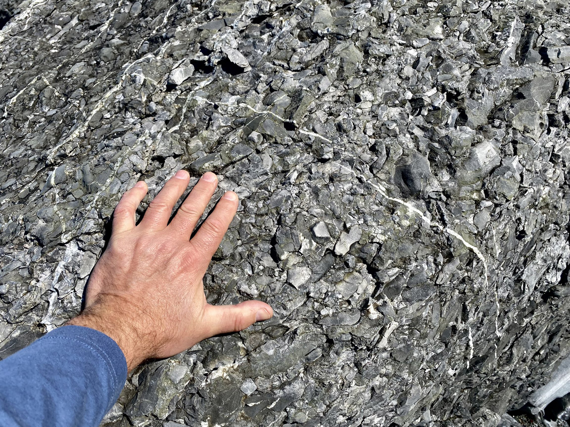 Originally, these deep water sediments were deposited far to the east of Cox’s Cove. Then, about 465 million years ago, the continental margin started to collide with an island arc, which pushed the deep-water rocks up onto the continental shelf above a thrust fault. The layers in the slope rocks were crumpled into folds, some of which can be seen in the rocks on the beach. During deformation of the thicker layers, cracks opened up. Initially the cracks were filled with water carrying dissolved lime, from which calcite crystals were in the cracks to make veins. However, in some cases, oil formed from the decaying organic matter in the mudstone, filled the cracks instead, or as well as water. Later heating converted the oil to solid bitumen, which remains in the cracks to this day.