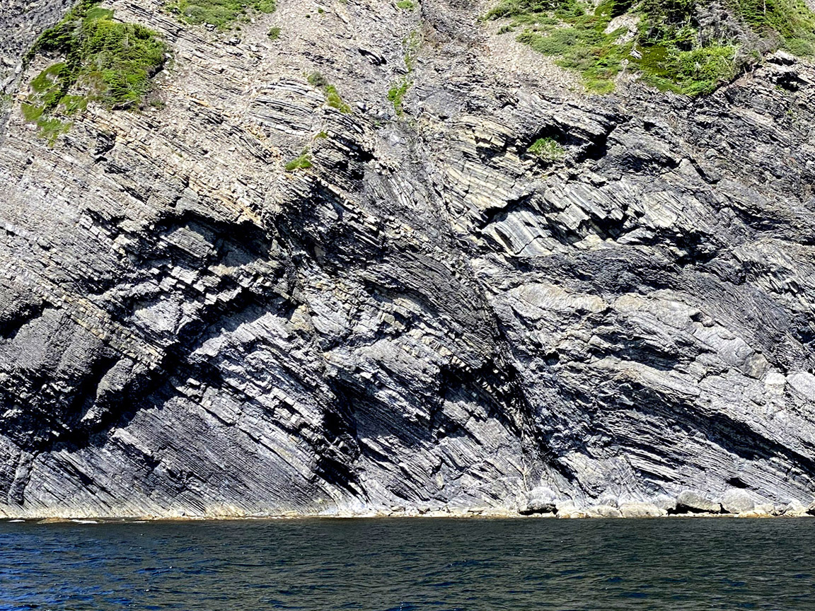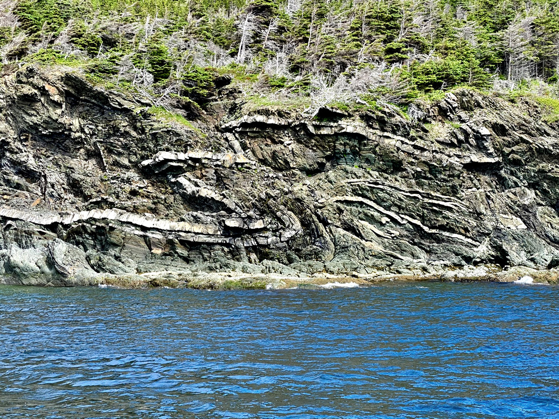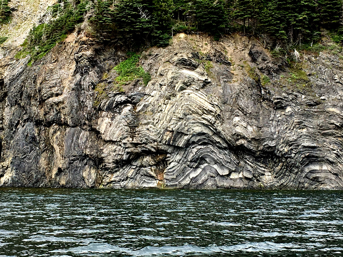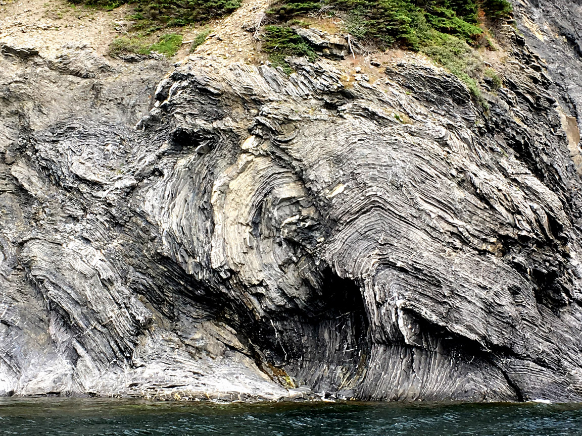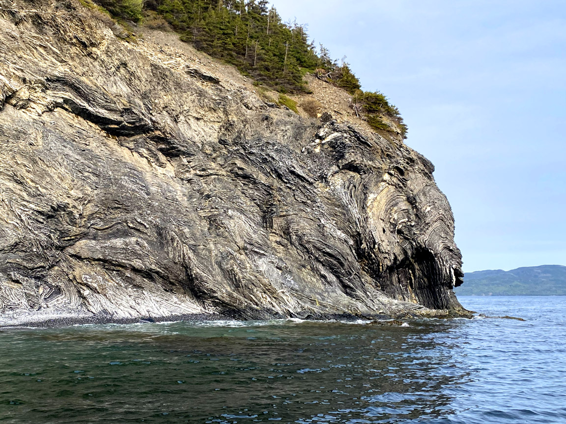 More examples of folded limestone can be seen across Middle Arm at Northern Head (aka Big Head). There, it’s possible to deduce that early folds formed as the rocks were thrust westward and re-folded between approximately 450 and 430 million years ago as other plates collided with Laurentia from the east, producing wildly contorted patterns of layers in the cliffs.