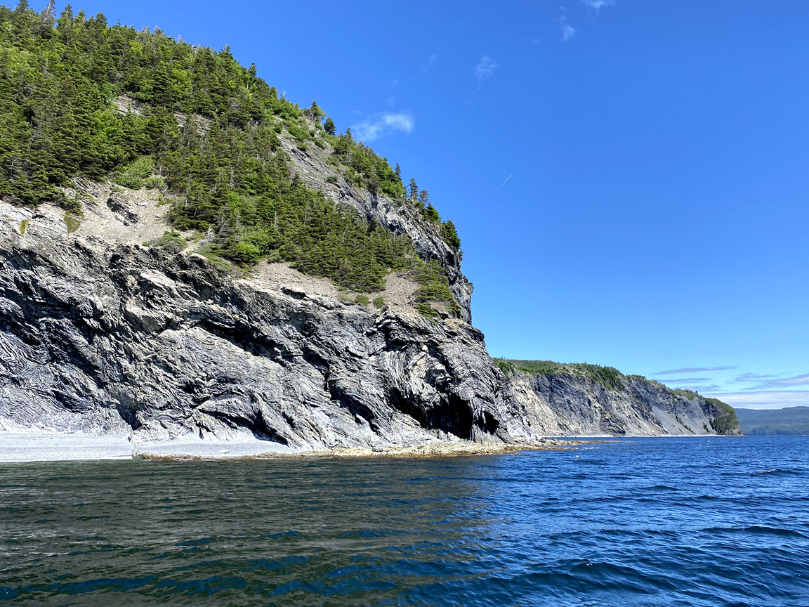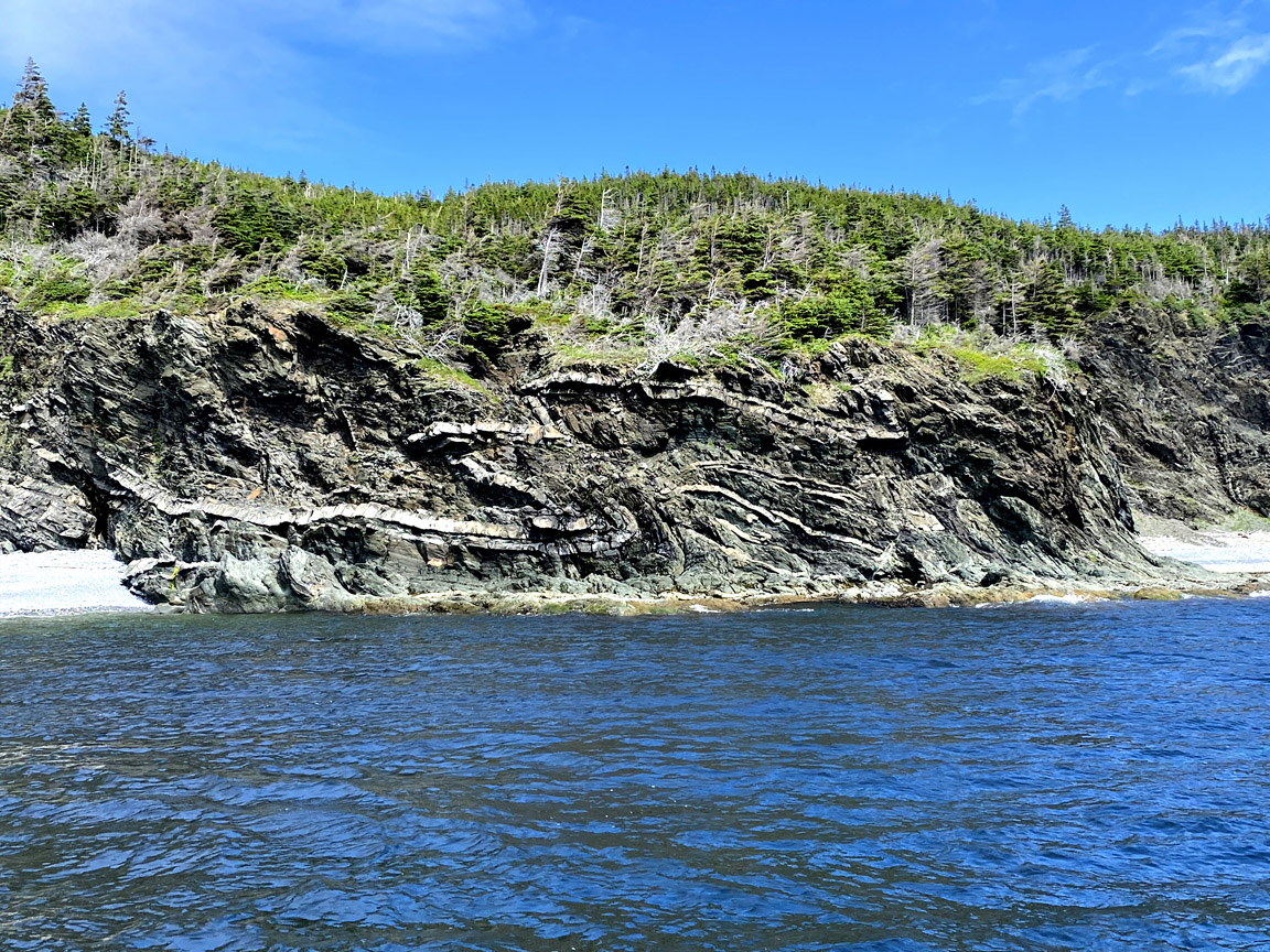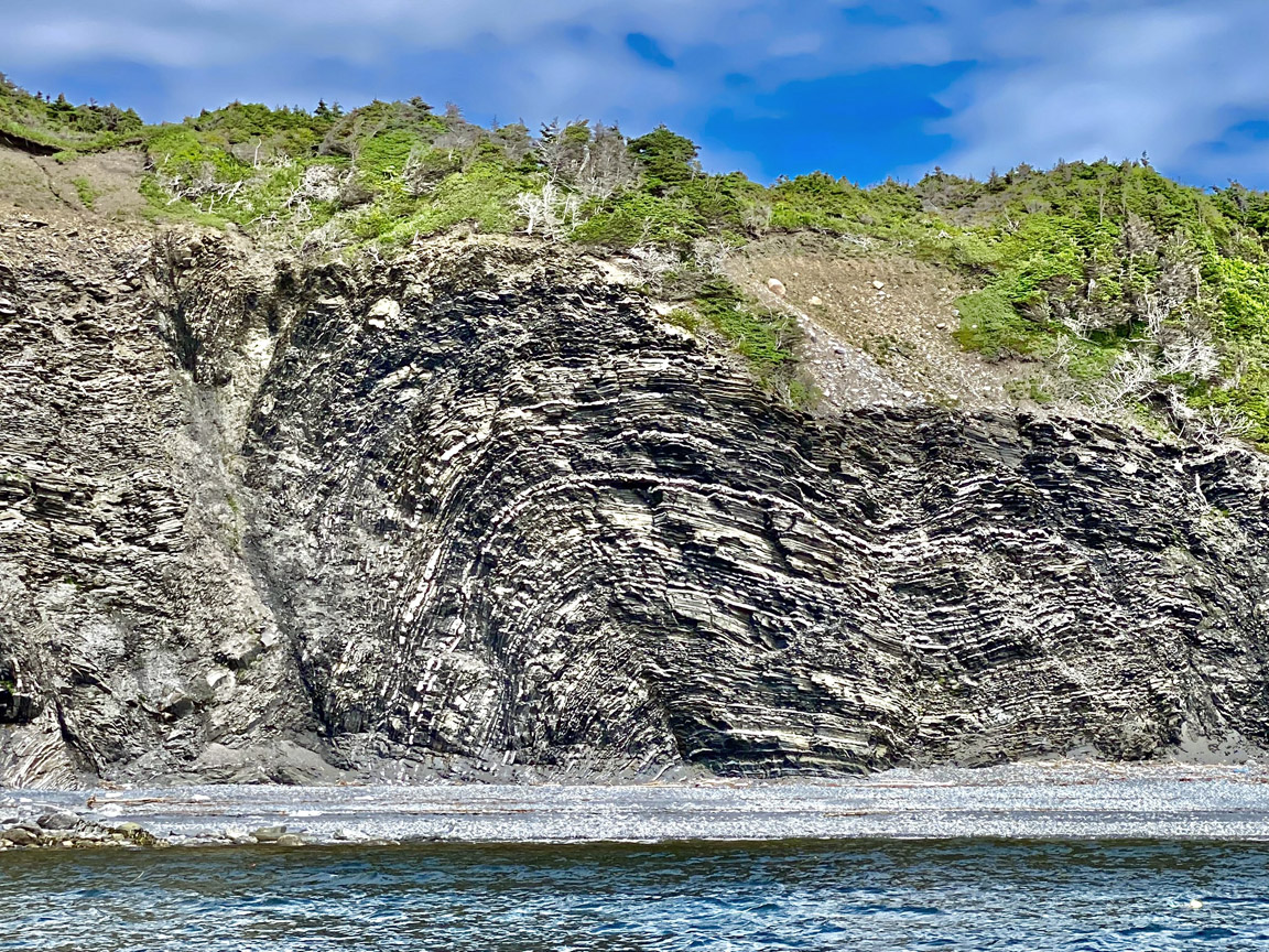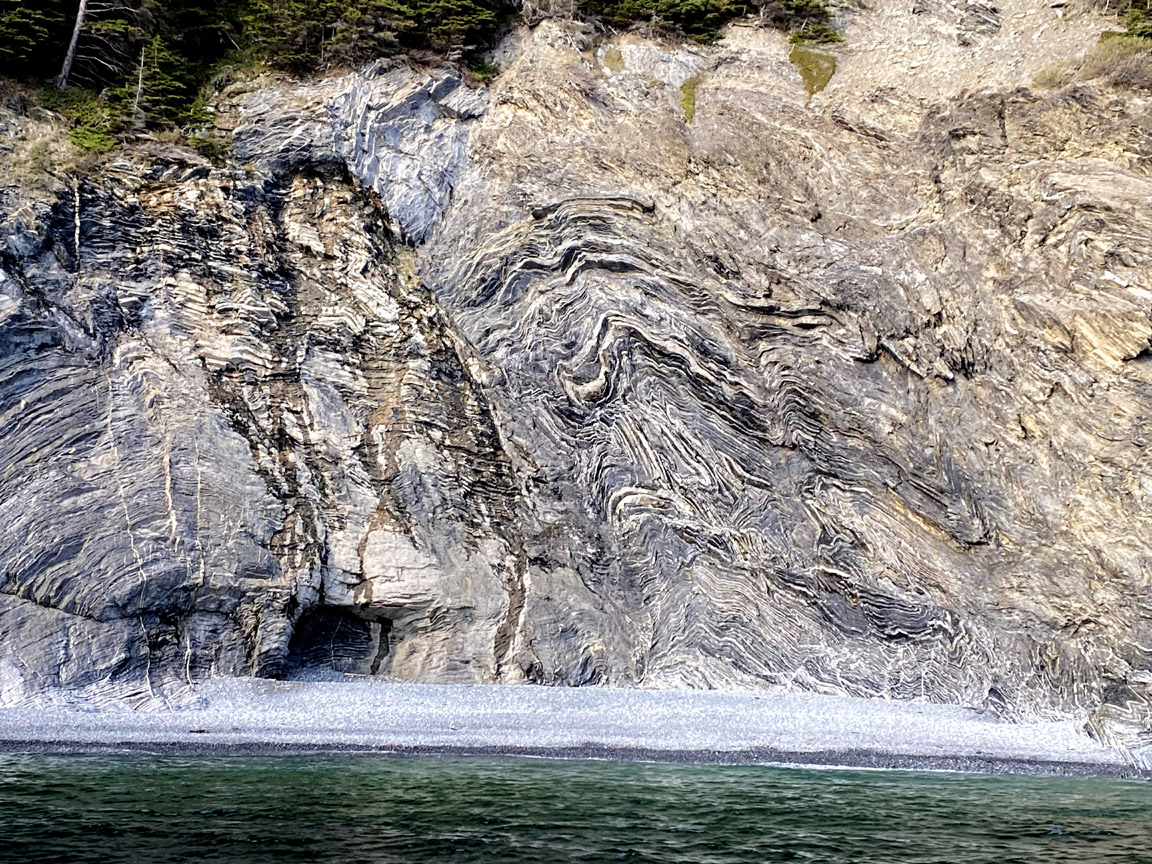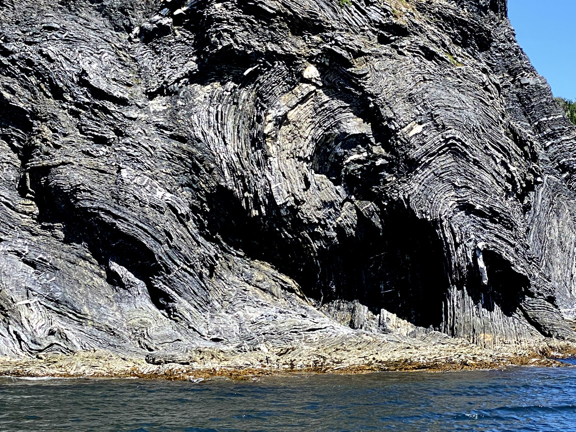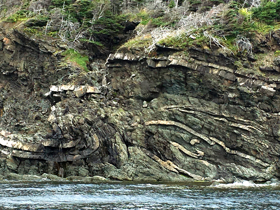 More examples of folded limestone can be seen across Middle Arm at Northern Head (aka Big Head). There, it’s possible to deduce that early folds formed as the rocks were thrust westward and re-folded between approximately 450 and 430 million years ago as other plates collided with Laurentia from the east, producing wildly contorted patterns of layers in the cliffs.