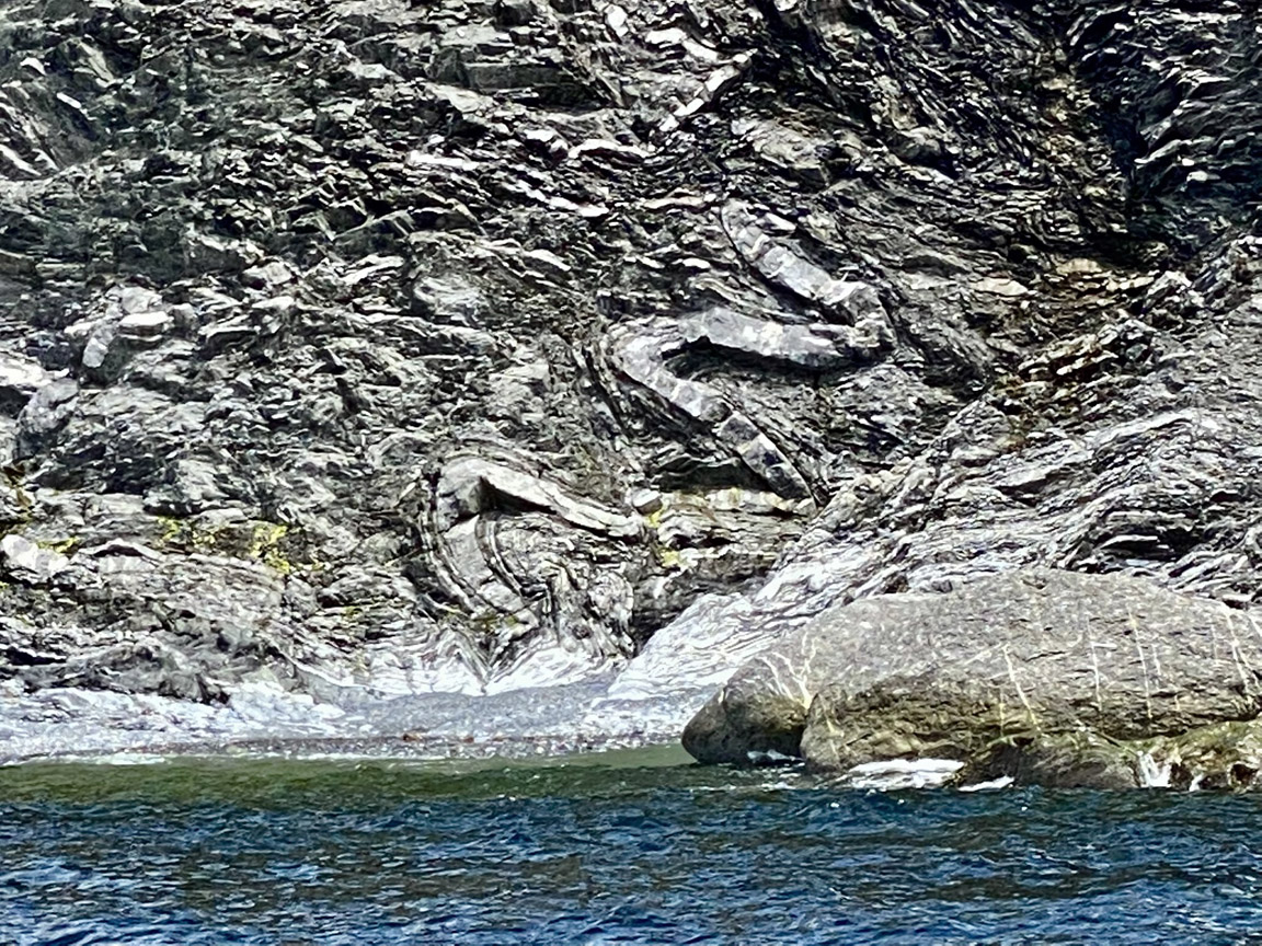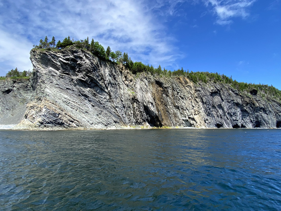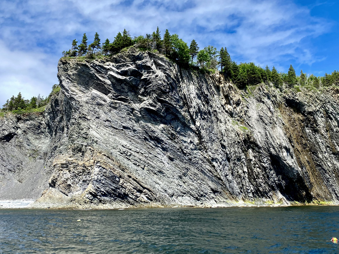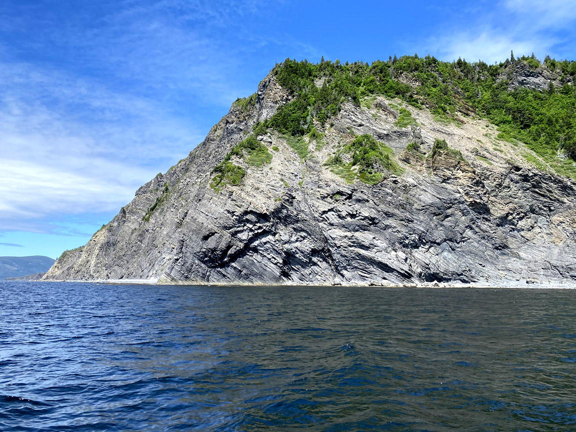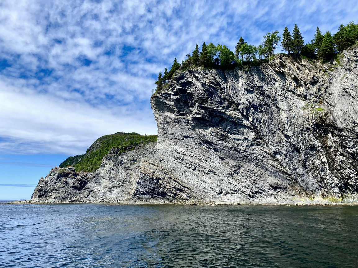 More examples of folded limestone can be seen across Middle Arm at Northern Head (aka Big Head). There, it’s possible to deduce that early folds formed as the rocks were thrust westward and re-folded between approximately 450 and 430 million years ago as other plates collided with Laurentia from the east, producing wildly contorted patterns of layers in the cliffs.