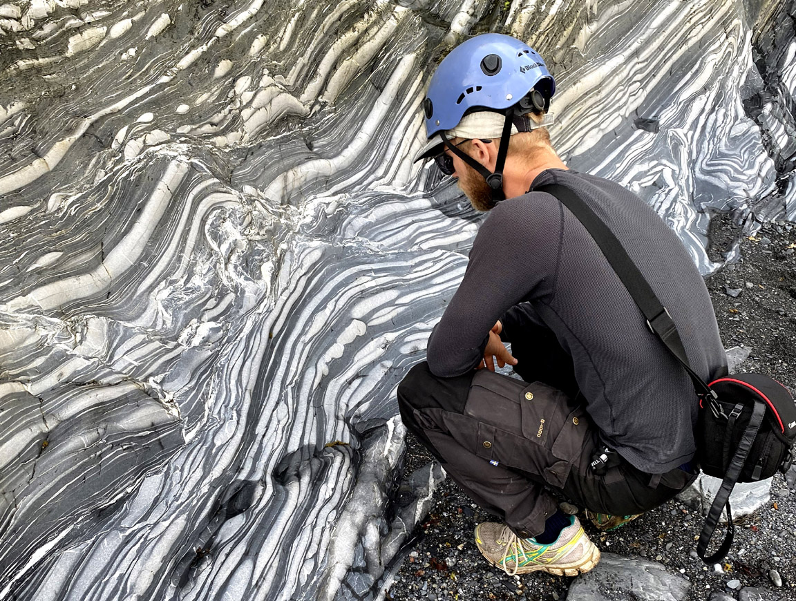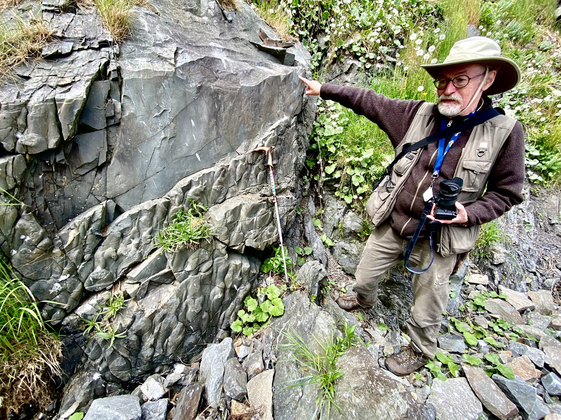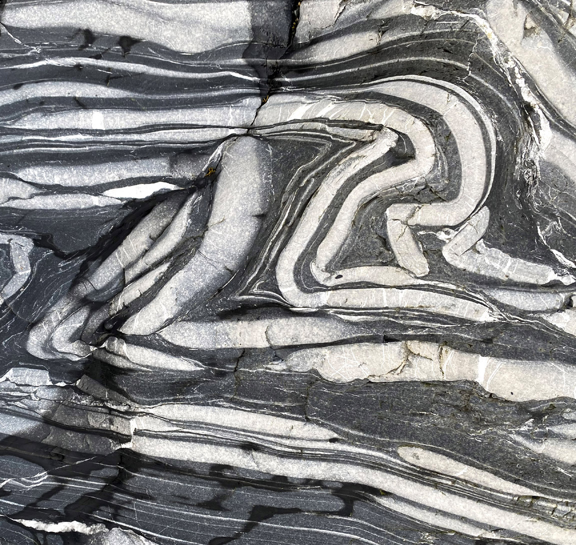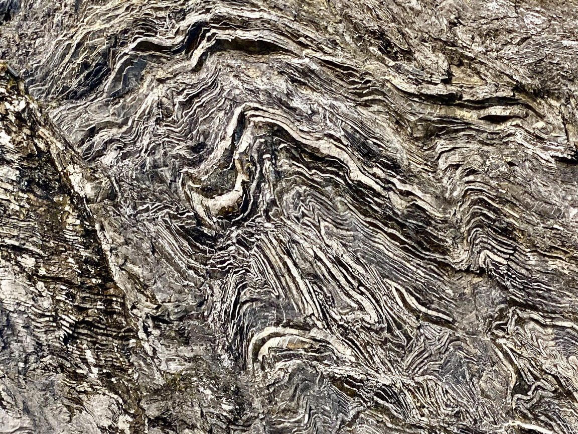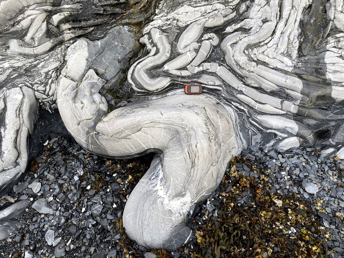 More examples of folded limestone can be seen across Middle Arm at Northern Head (aka Big Head). There, it’s possible to deduce that early folds formed as the rocks were thrust westward and re-folded between approximately 450 and 430 million years ago as other plates collided with Laurentia from the east, producing wildly contorted patterns of layers in the cliffs.