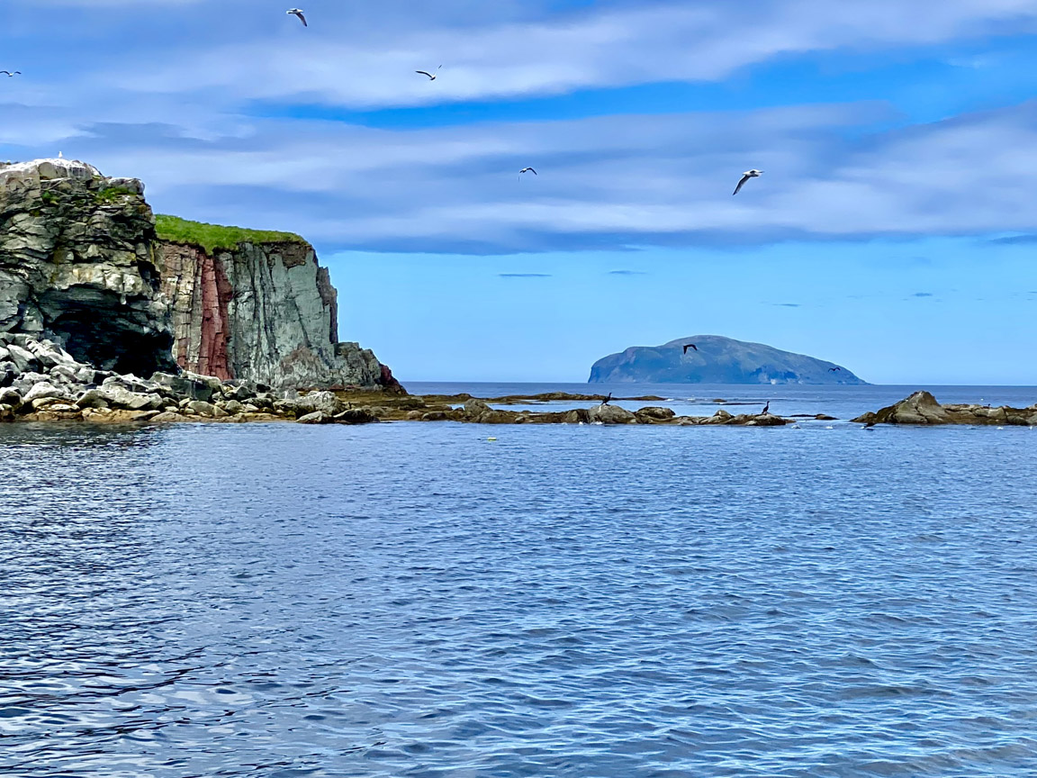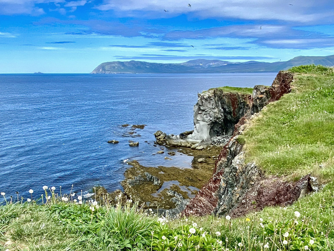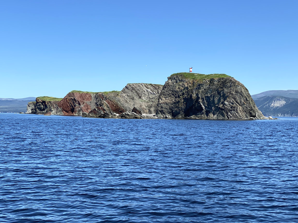 As its name suggests, this small 1/2 km long island 2 km west of Northern (Big) Head is composed primarily of sedimentary rocks belonging to the Eagle Island Formation (part of the Western Brook Pond Group) and Cooks Brook/Middle Arm Point Formations (part of the Cow Group). It is characterized by folded, steeply dipping strata displaying a combination of sedimentary rock sequences and marine deposits. Rock types include grey and green lithic sandstones, red sandstones, and gray shale. In summer, the flat island is covered in grass and a profusion of wild flowers and is a breeding ground for seagulls that is only accessible by boat.
