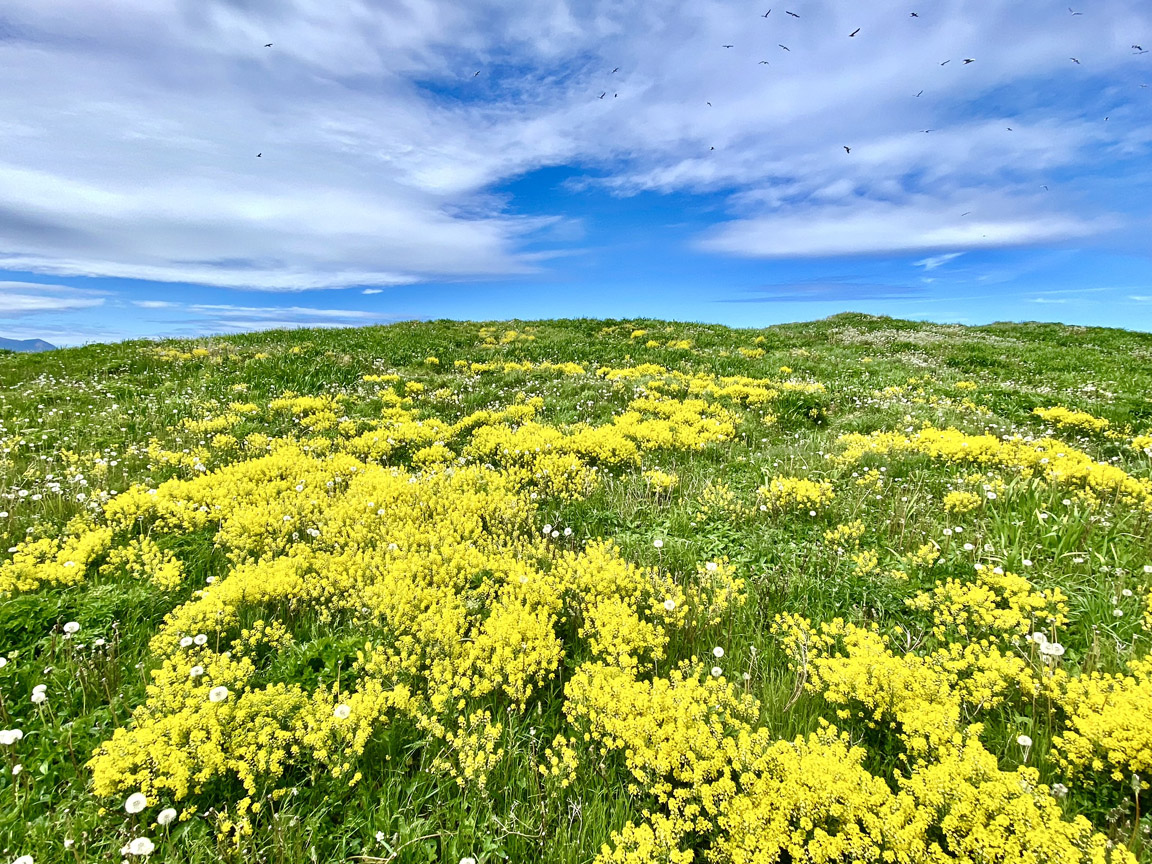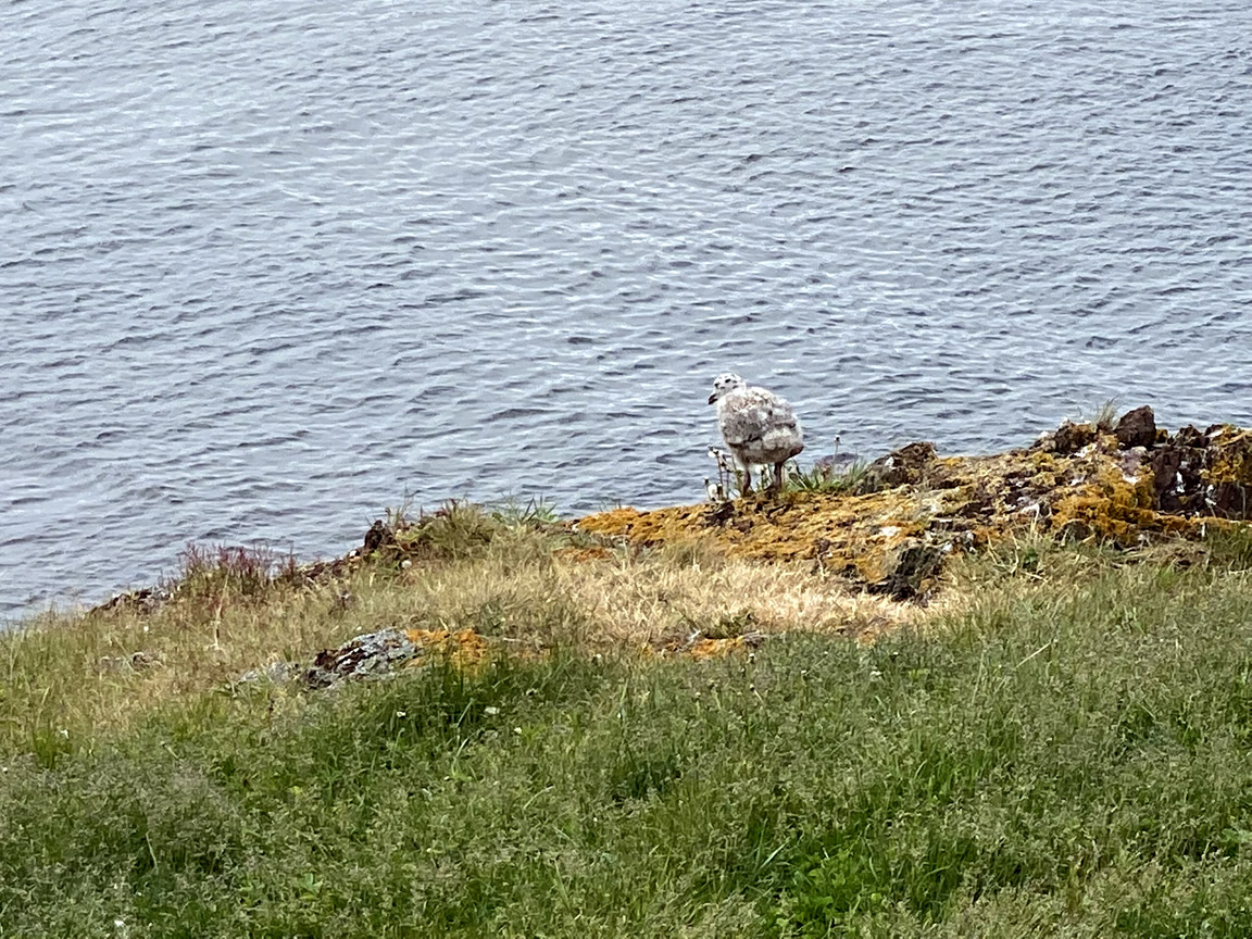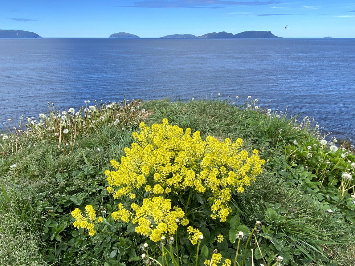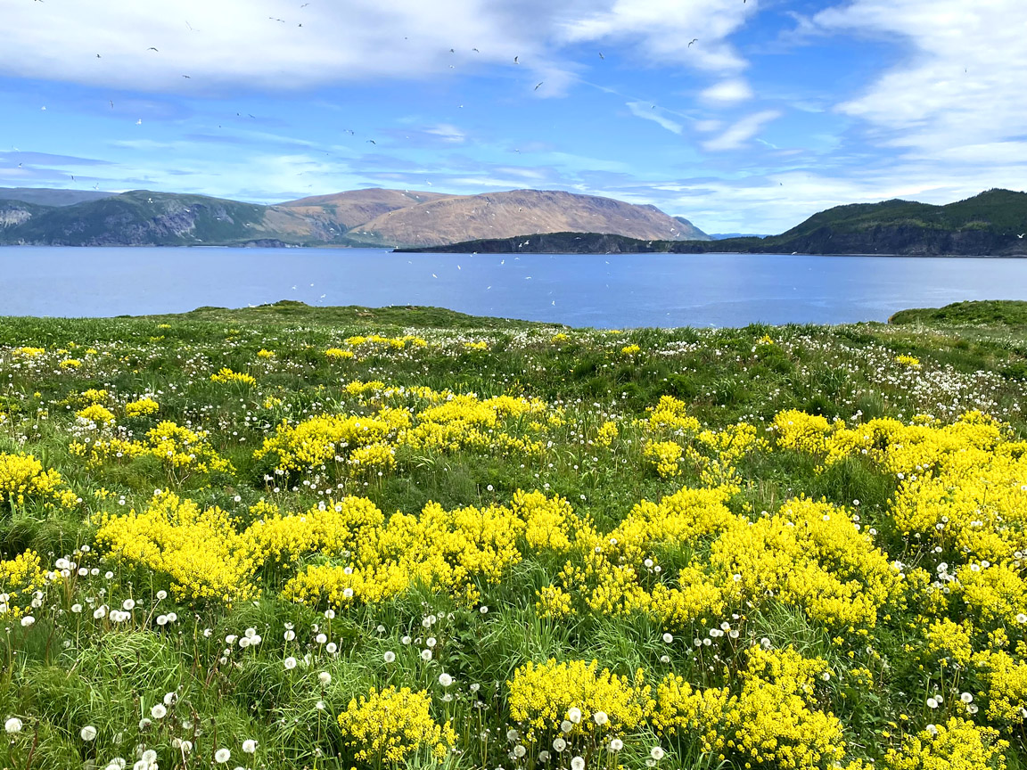 As its name suggests, this small 1/2 km long island 2 km west of Northern (Big) Head is composed primarily of sedimentary rocks belonging to the Eagle Island Formation (part of the Western Brook Pond Group) and Cooks Brook/Middle Arm Point Formations (part of the Cow Group). It is characterized by folded, steeply dipping strata displaying a combination of sedimentary rock sequences and marine deposits. Rock types include grey and green lithic sandstones, red sandstones, and gray shale. In summer, the flat island is covered in grass and a profusion of wild flowers and is a breeding ground for seagulls that is only accessible by boat.