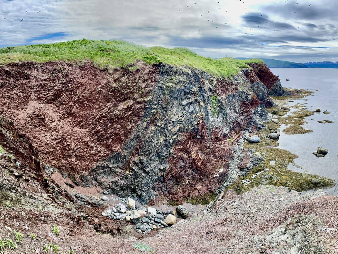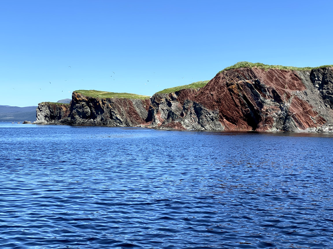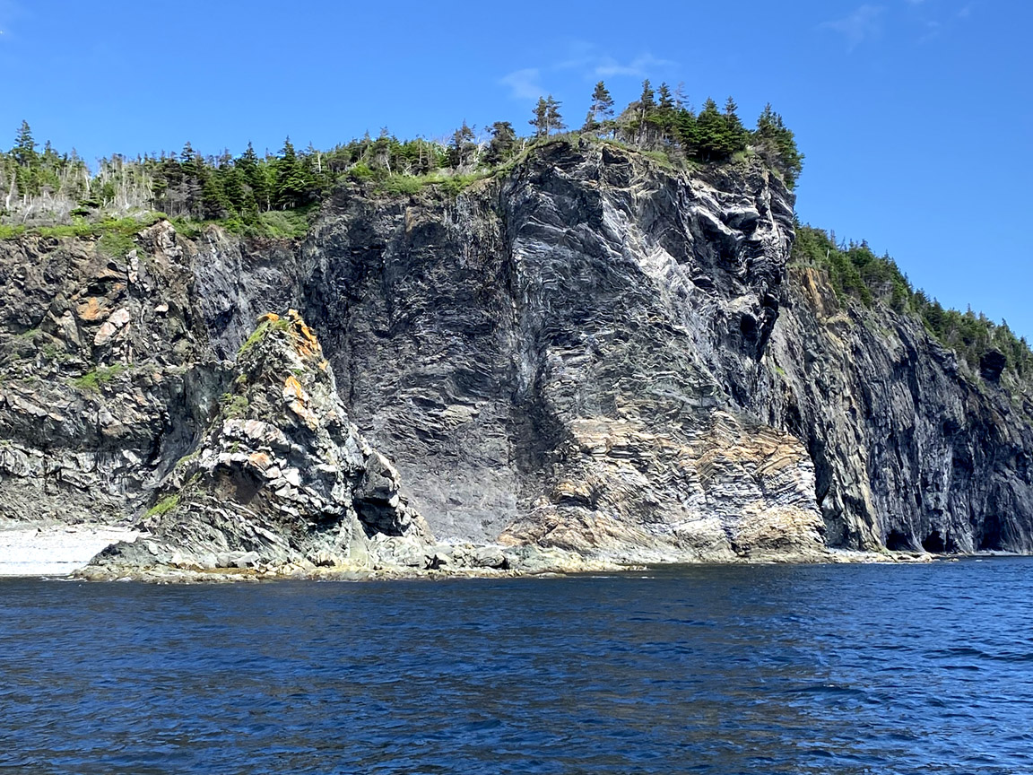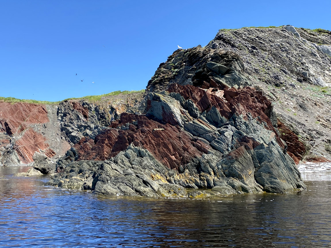 - Seabird nests on the cliffs of these deep water sedimentary rocks can be observed at 49.1657N, -58.1471 W.