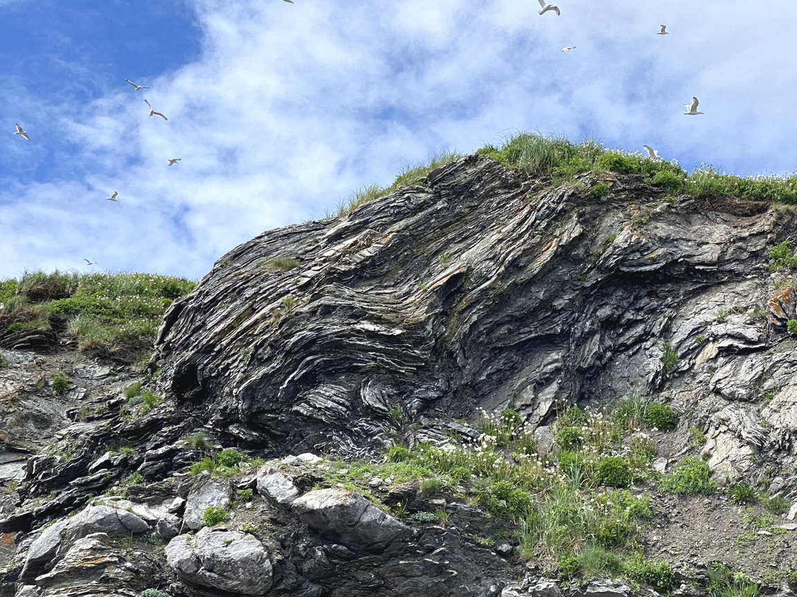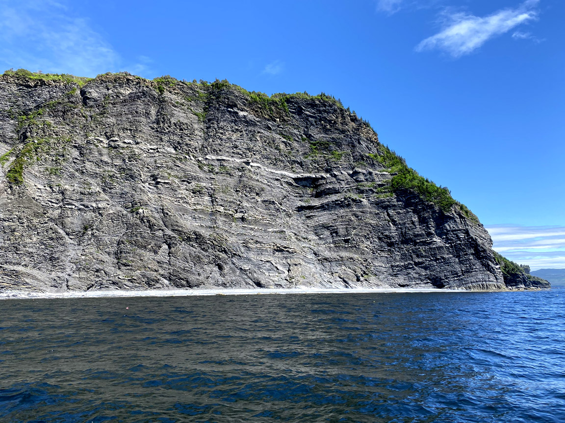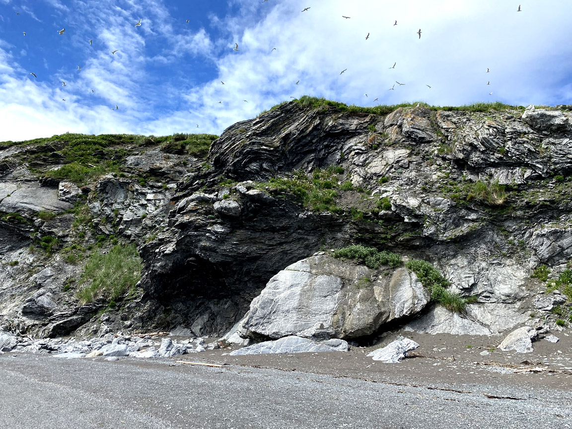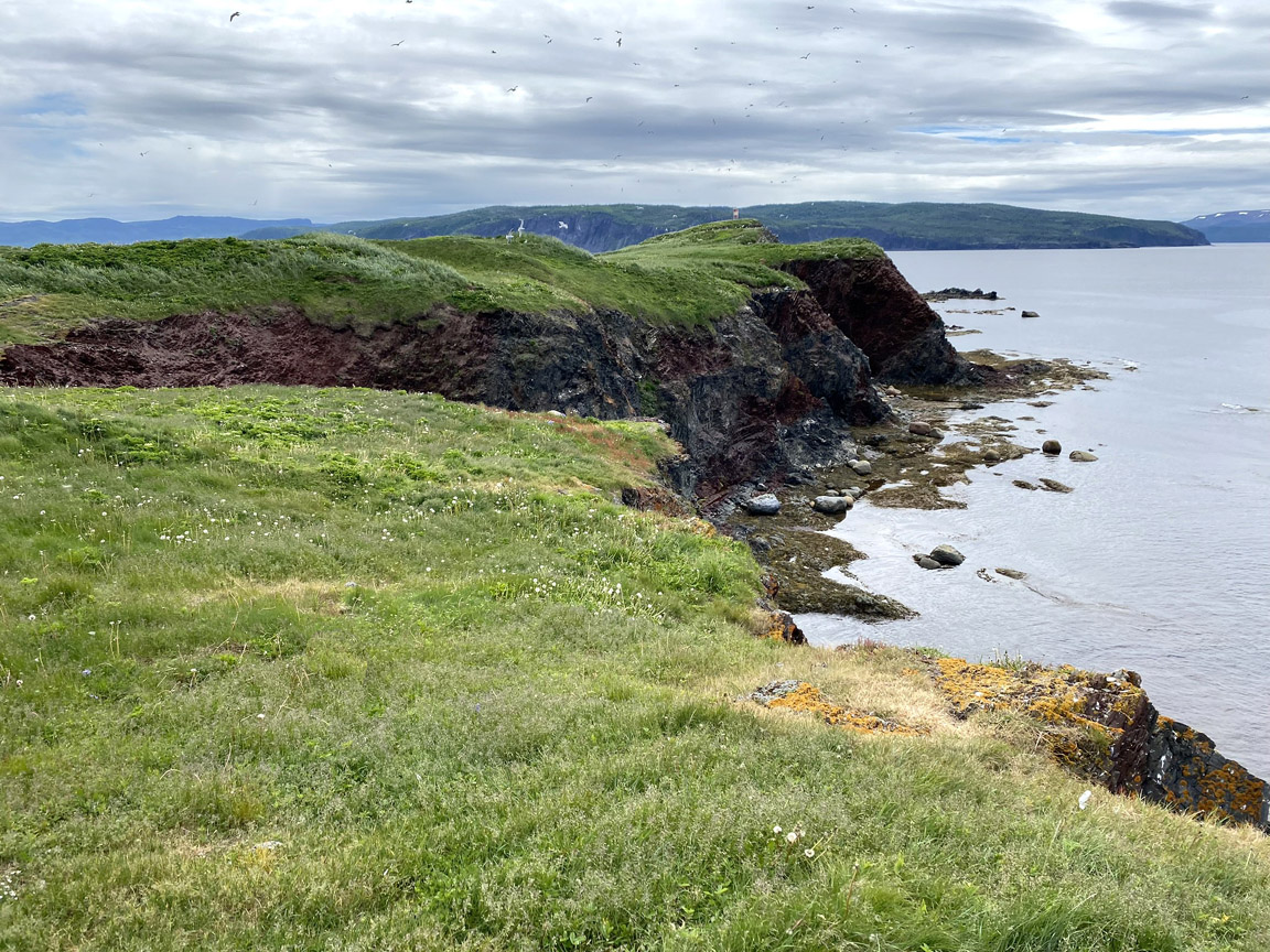 - Seabird nests on the cliffs of these deep water sedimentary rocks can be observed at 49.1657N, -58.1471 W.